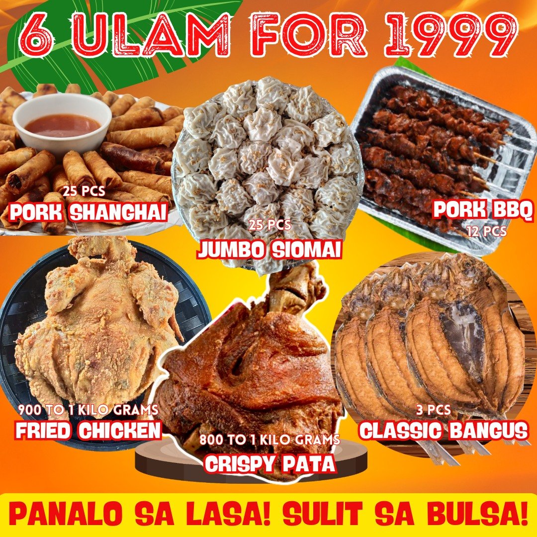 INCLUSION:25PCS PORK SHANGHAI 25PCS JUMBO SIOMAI 12INCHES PANSIT 12PCS PORK BBQ 900G TO 1KL FRIED CHICKEN 800G TO 1KL CRISPY PATA 3PCS CLASSIC BANGUS