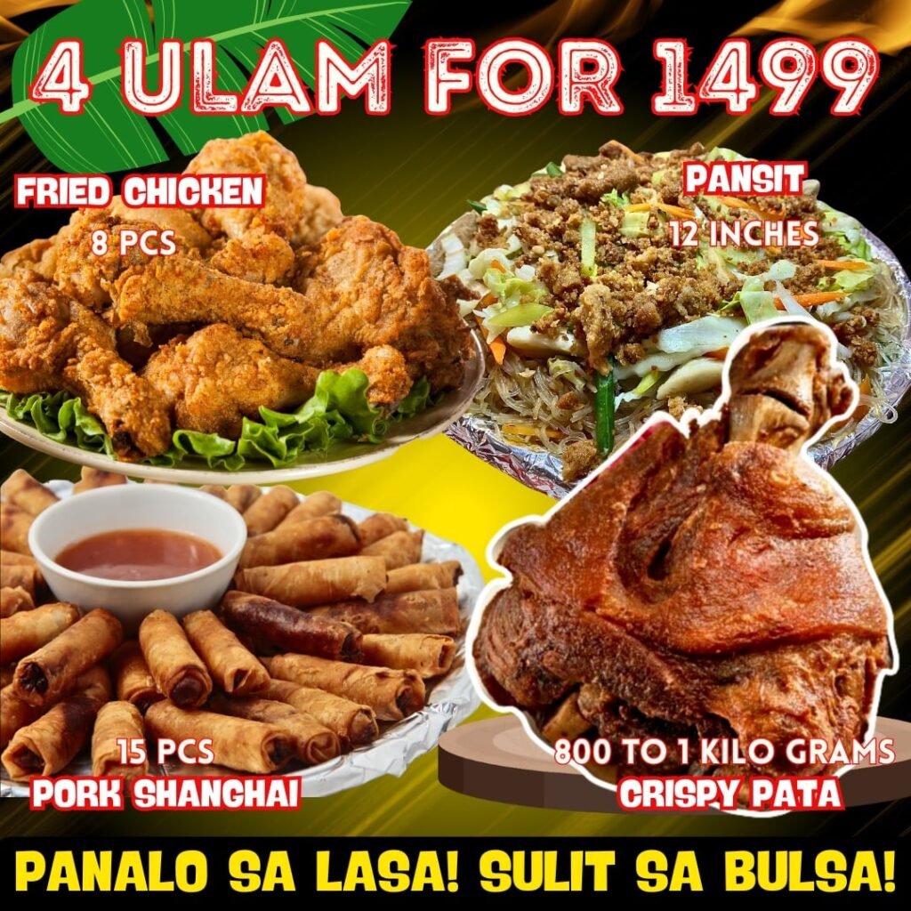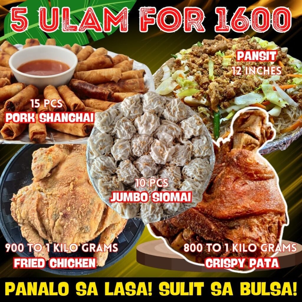 INCLUSION:25PCS PORK SHANGHAI 25PCS JUMBO SIOMAI 12PCS PORK BBQ 15PCS SHRIMP TEMPURA 12INCHES PANSIT 900G TO 1KL FRIED CHICKEN 800G TO 1KL CRISPY PATA 3PCS CLASSIC BANGUS